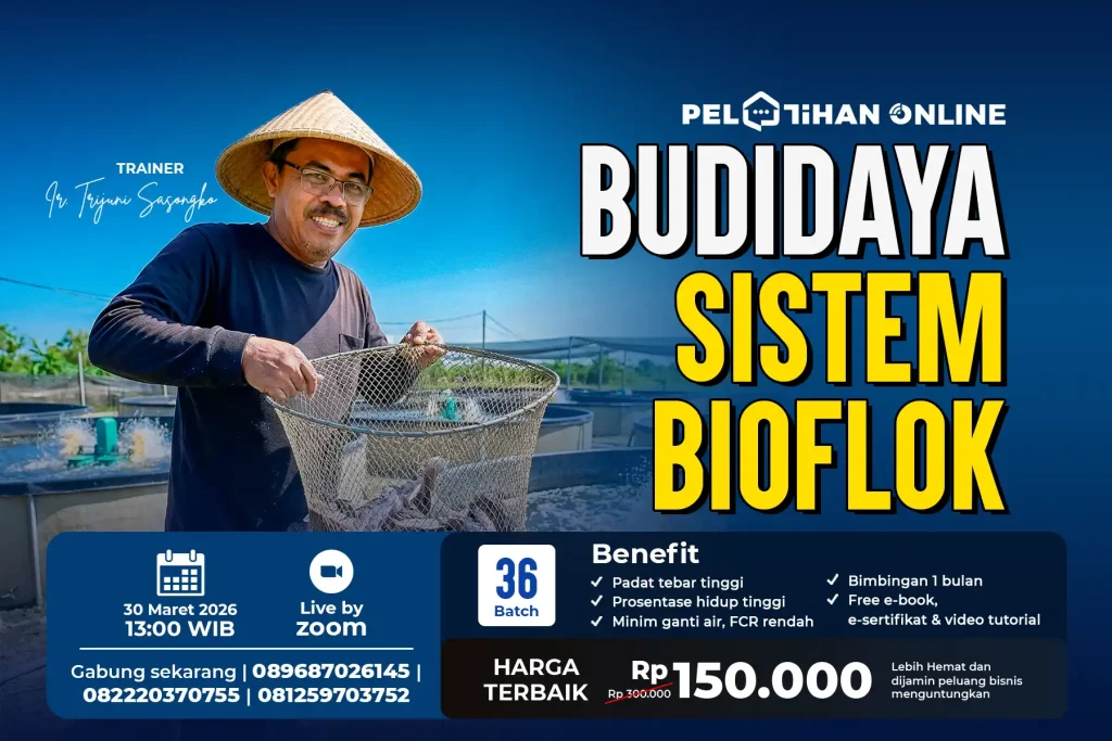 Sistem bioflok bisa meningkatkan kualitas hasil panen ikan. Tak hanya itu, sistem bioflok juga menjadi sistem budidaya yang jauh lebih mudah untuk diterapkan. Untuk dulur yang tertarik mempelajari teknik budidaya yang satu ini, dulur bisa langsung aja gabung dengan meng-klik gambar di bawah ini.
