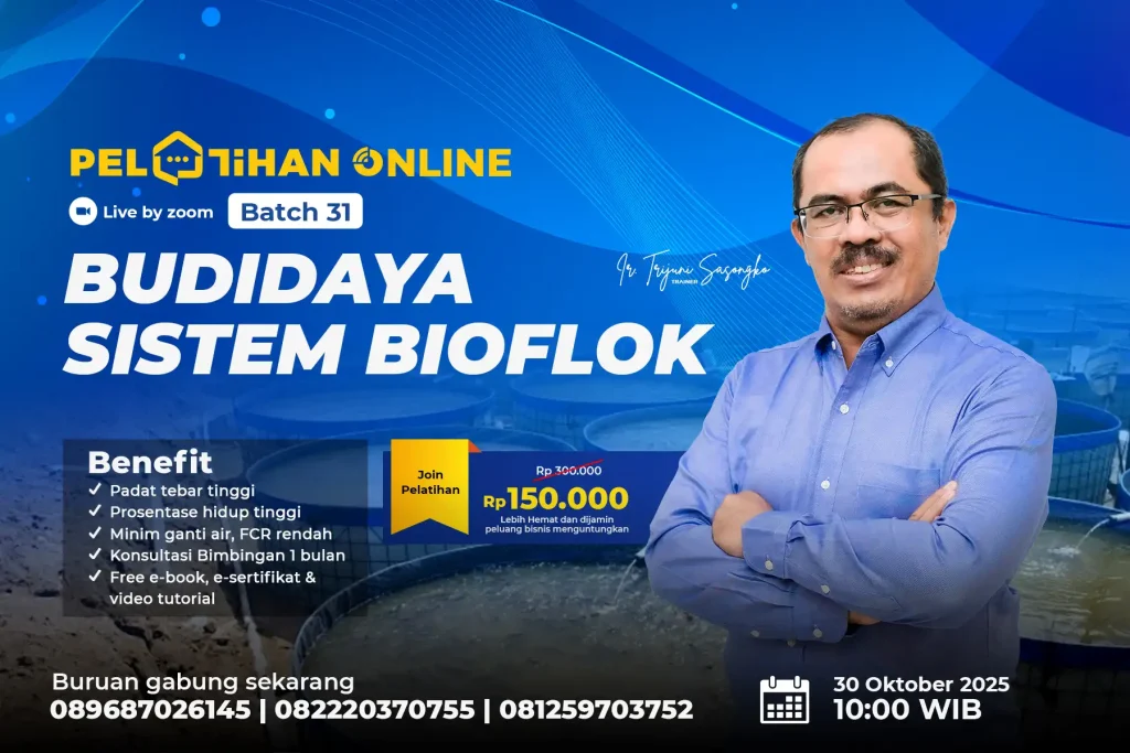 Sistem bioflok bisa meningkatkan kualitas hasil panen ikan. Tak hanya itu, sistem bioflok juga menjadi sistem budidaya yang jauh lebih mudah untuk diterapkan. Untuk dulur yang tertarik mempelajari teknik budidaya yang satu ini, dulur bisa langsung aja gabung dengan meng-klik gambar di bawah ini.